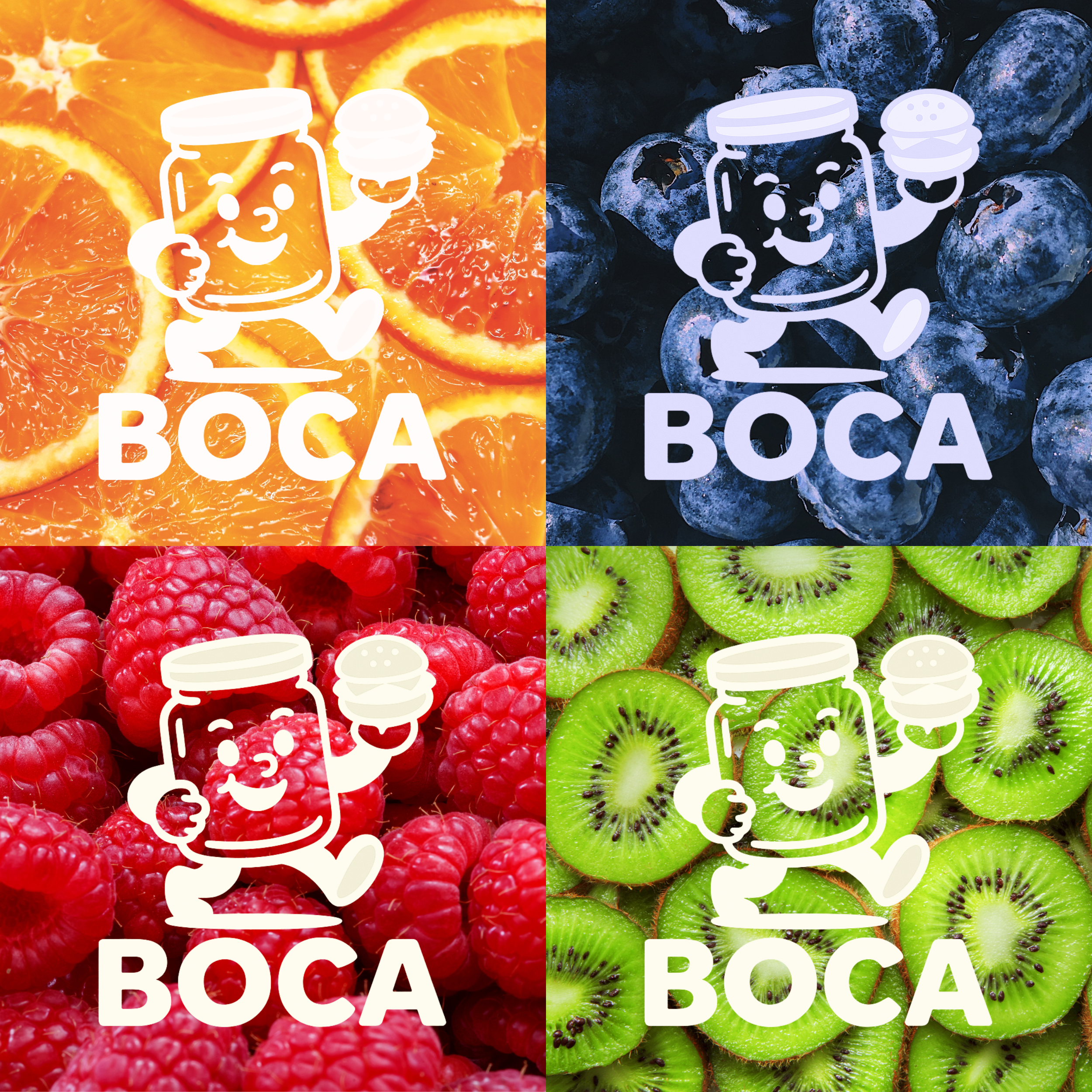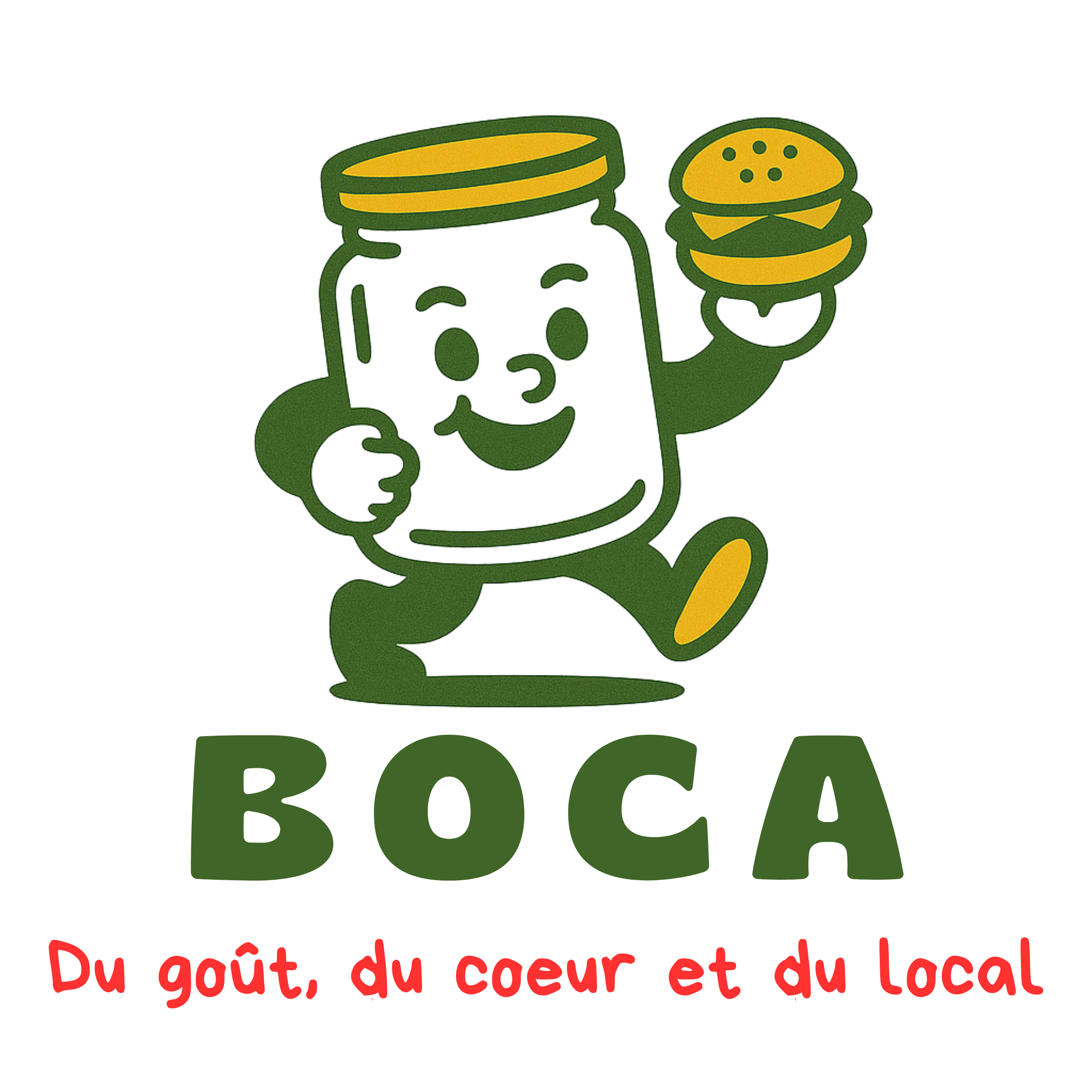 Pour donner une image forte à la marque, j’ai choisi d’incarner BOCA à travers une mascotte : un bocal personnifié, souriant et dynamique, tenant un burger à la main. Ce personnage illustre l’idée d’un produit à la fois rapide et gourmand, mais préparé avec soin. Le vert symbolise la fraîcheur et l’ancrage local, tandis que le jaune évoque la gourmandise et l’énergie.