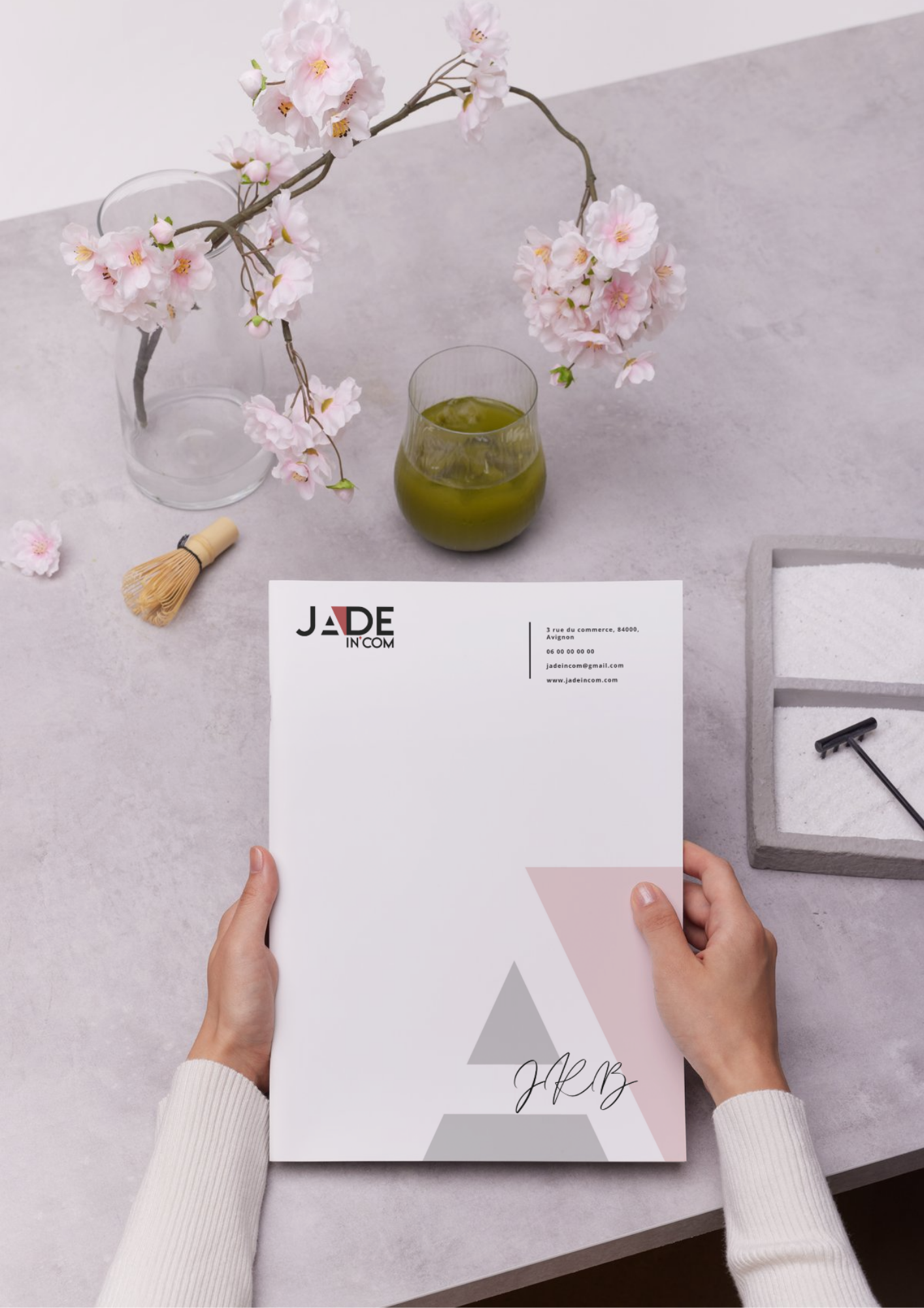 Pour mettre en valeur l’identité de JADE IN’COM, j’ai réalisé un mock-up de papier en-tête. Le grand A stylisé en bas à droite apporte une touche graphique élégante sans nuire à la lisibilité, et renforce la cohérence visuelle de l’identité. Sobre et professionnel, ce support montre que le logo s’adapte parfaitement à l’univers de l’immobilier, en alliant rigueur, stabilité et modernité.
