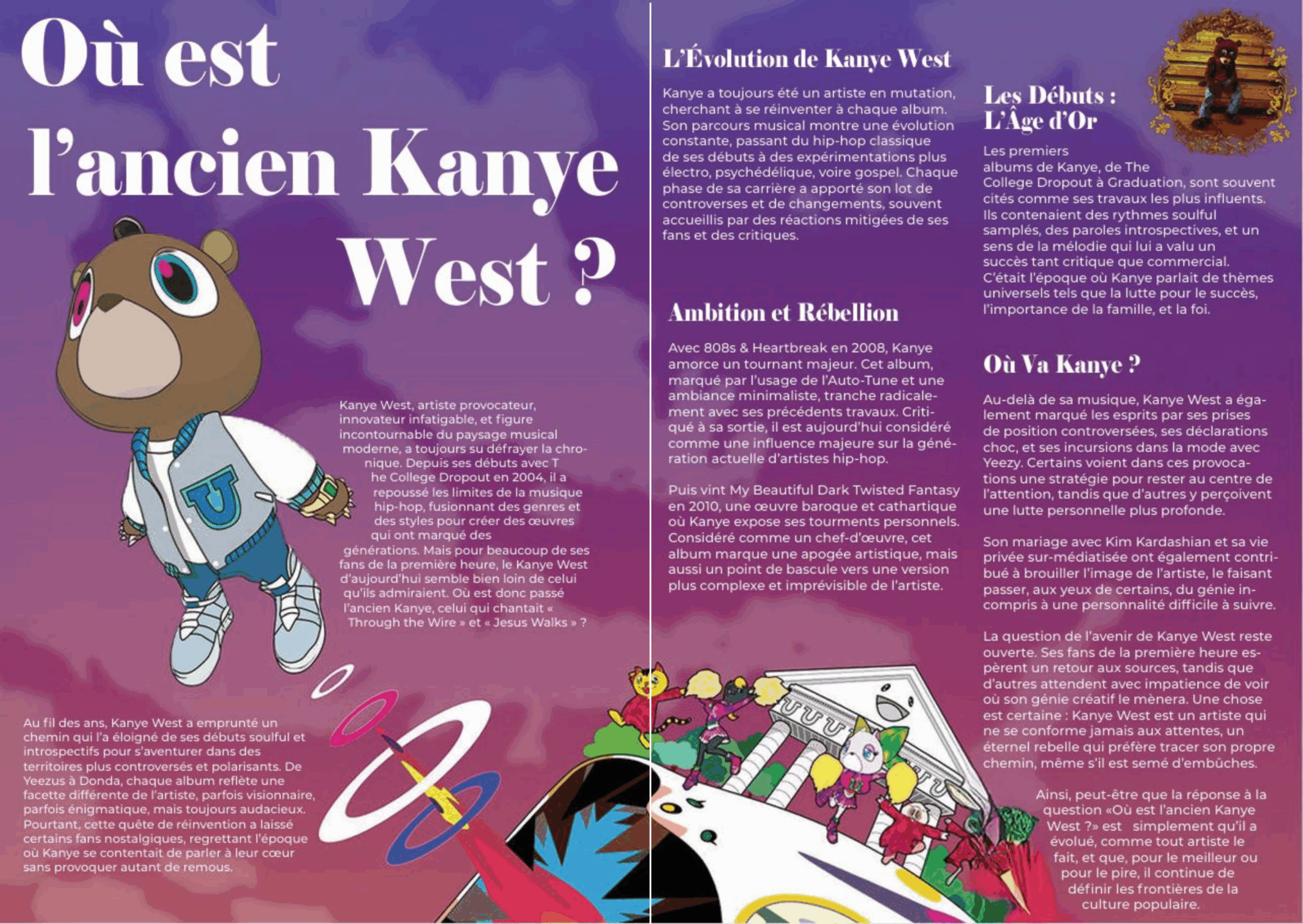 Ensuite, j’ai utilisé Photoshop pour adapter certains visuels : j’ai notamment retravaillé des pochettes d’albums de rap pour les transformer en fonds couvrant des doubles pages entières, en les agrandissant et en les harmonisant pour conserver leur impact. Enfin, l’ensemble du travail de mise en page et de structuration éditoriale a été réalisé sur InDesign, qui m’a permis de composer la couverture, d’agencer les rubriques, de jouer avec la typographie et de gérer l’équilibre entre textes et images.